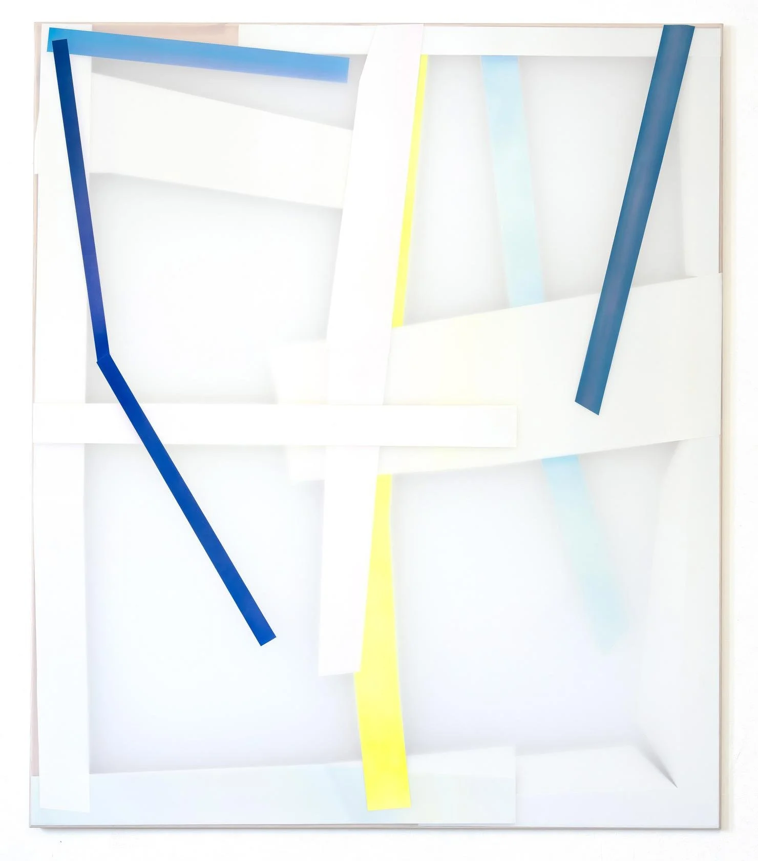 Artjom schöpft seine Inspiration aus der urbanen Umgebung – Muster und Formen, die an architektonische Strukturen erinnern, ziehen sich durch seine Arbeiten. Sie tauchen hinter dem feinen Stoff auf, mal deutlich sichtbar, mal nur angedeutet. So entstehen Werke an der Schnittstelle zwischen Abstraktion und Architektur, die in der Schwebe halten, was sichtbar ist – und was verborgen bleibt.